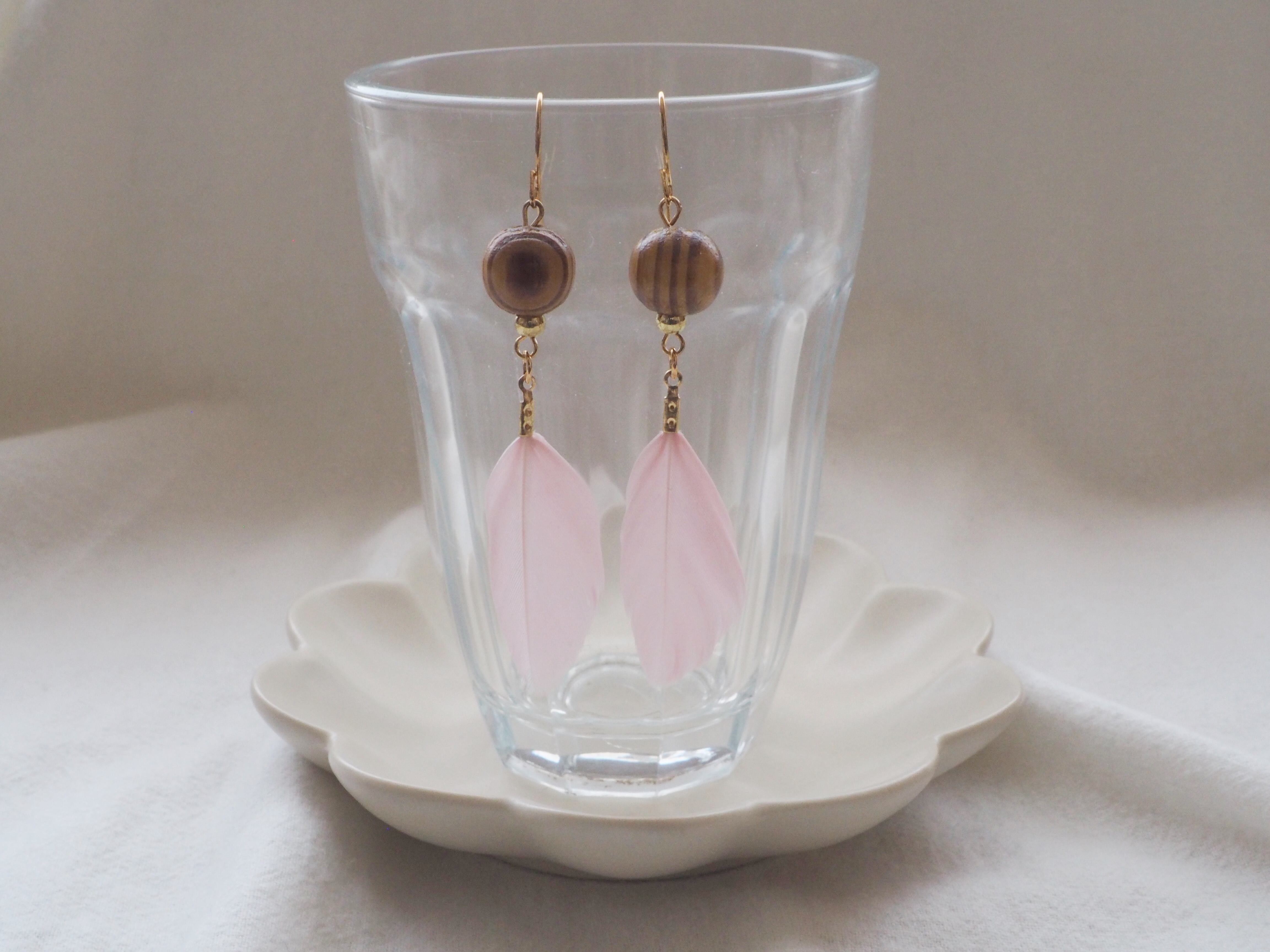木製の玉とピンク色のフェイク羽がゆらゆら揺れるかわいいピアスです♪
